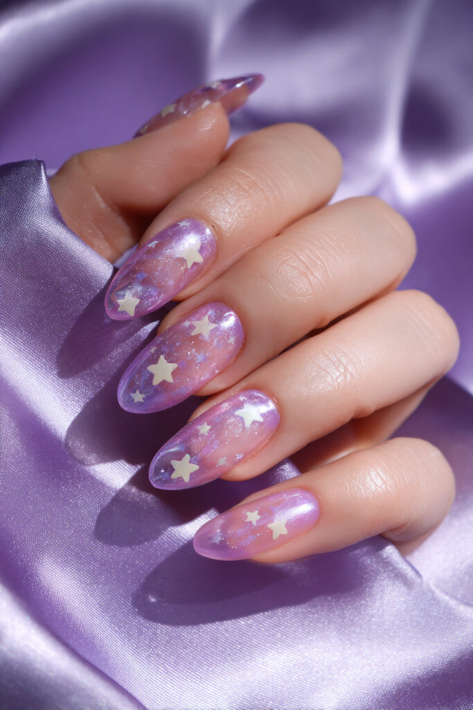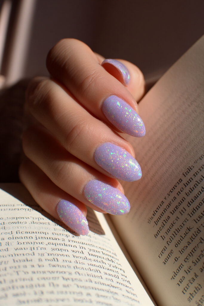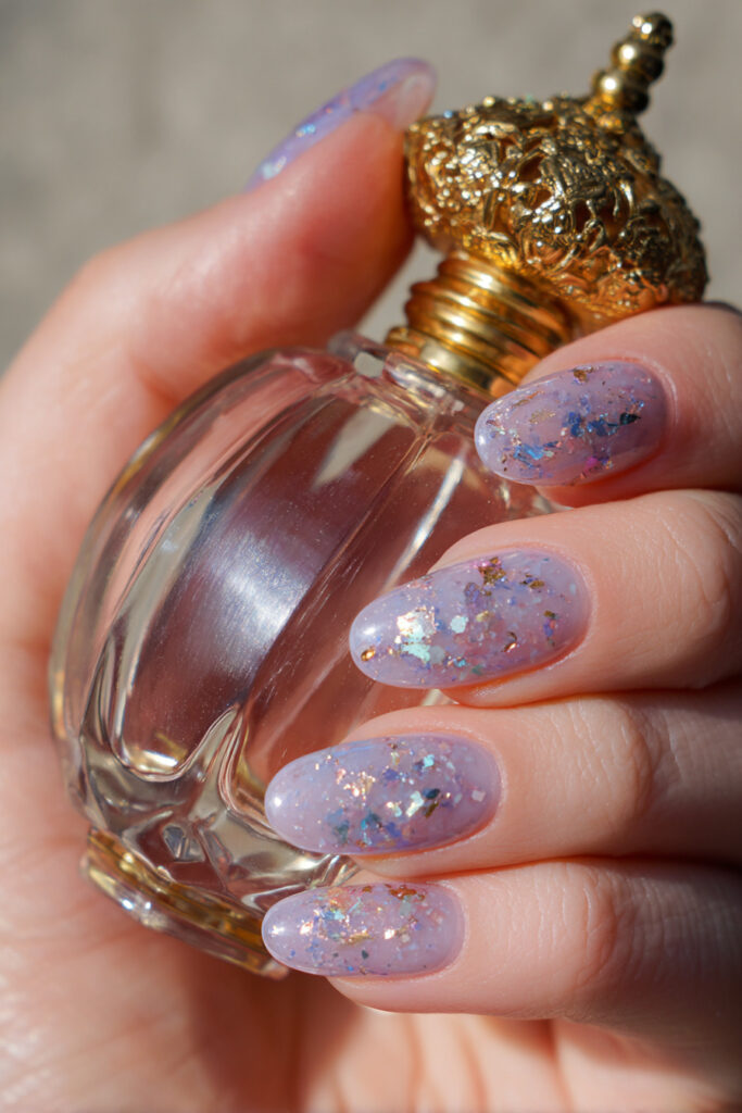 8. Lilac Jelly Nails with Iridescent Flakes
