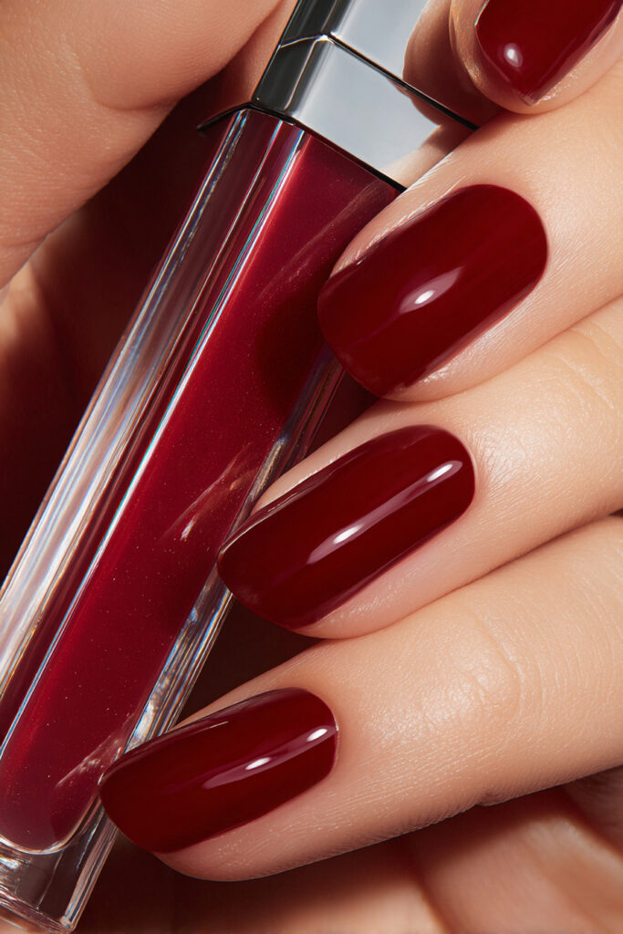 High-gloss deep cherry red jelly nails so reflective they mirror the surroundings, a pure glass-skin finish with zero added texture. The full-mirror glass finish on a deep cherry red is one of the most powerful and minimal looks in translucent nail art — no inclusions, no shimmer, just the colour and the light and the perfect reflection. Timeless, bold, and endlessly elegant.