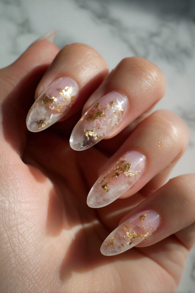 Completely see-through glass jelly nails with irregular gold leaf flakes visibly floating inside the nail body, catching light from every angle. The full-clear base is the boldest possible statement in jelly texture nail designs — nothing distracts from the gold leaf, and the nail itself becomes a tiny display case for the foils inside. One of the most architectural and minimal glazed nail designs in the collection.