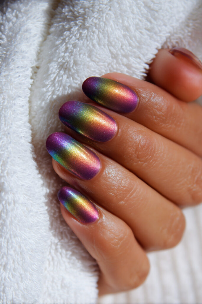 Deep semi-sheer grape purple jelly nails with a full rainbow aurora shift across the entire nail surface, from deep violet to green to gold. If peach aurora is a sunrise, grape rainbow shift is a full fireworks display — the most maximalist and spectacular of all the colour-shift jelly texture nail designs here. The depth of the grape base makes the rainbow shift even more dramatic by contrast.