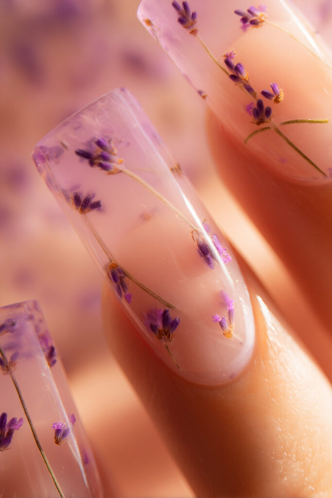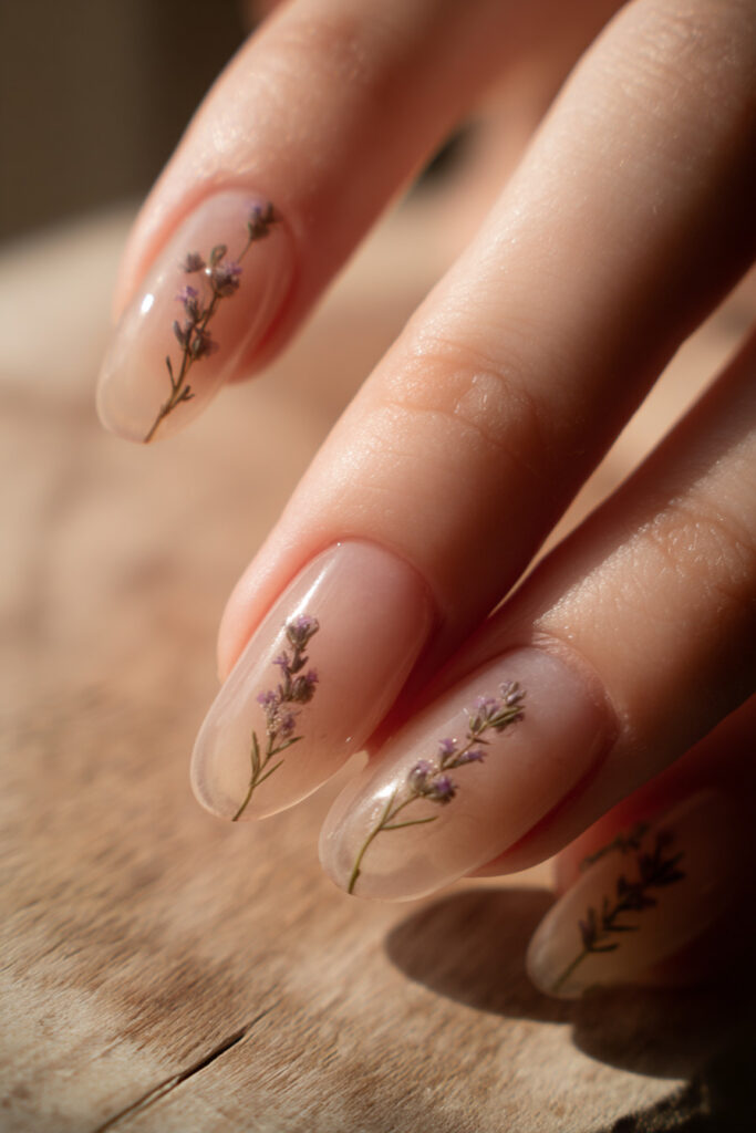 Barely-there nude sheer jelly nails with a visible tiny dried lavender sprig suspended inside each nail, clean and botanical. If the pink pressed flower nails are romantic, these are serene — a pared-back, almost-skin-tone base that lets the botanical inclusion do all the talking. One of the most minimalist and wearable sheer nail polish ideas in the set, and perfect for anyone who wants the jelly trend without a heavy colour commitment.