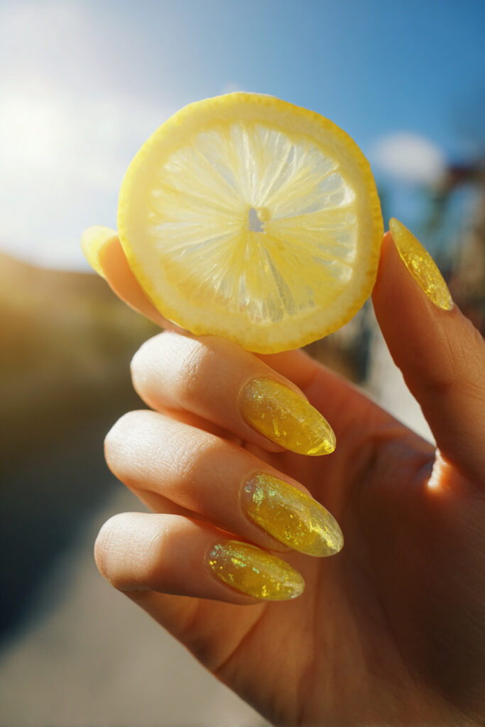 11. Lemon Yellow Jelly Nails with Citrus Slice Foil