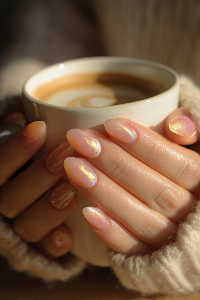 12. Peach Jelly Nails with Aurora Shimmer