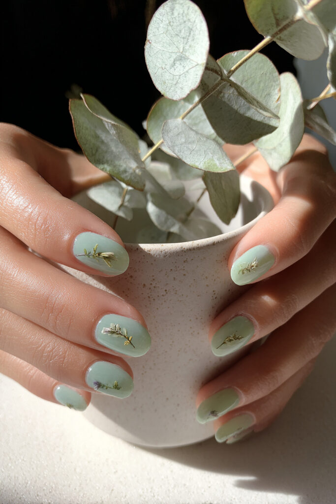 3. Sage Green Jelly Nails with Dried Herb Sprigs