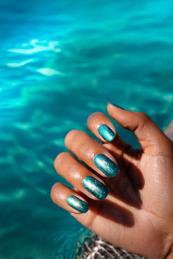 Deep translucent teal jelly nails layered with mermaid-effect shimmer shifting between teal, aqua and silver, like light through ocean water. The mermaid shimmer in a teal base is one of the most cohesive and immersive jelly texture nail designs in this section — the colour shift stays within the same ocean colour family, creating depth rather than distraction. Deeply satisfying glazed nail designs.