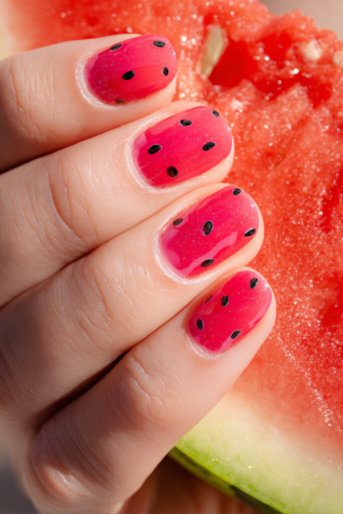 Semi-sheer watermelon pink jelly nails with tiny oval black seed-shaped foils clearly suspended inside the gel, playful and literal. This is cute nail art inspiration at its most delightfully committed — a nail that actually looks like the inside of a watermelon slice, down to the seeds. Joyful, summery, and guaranteed to make people smile.