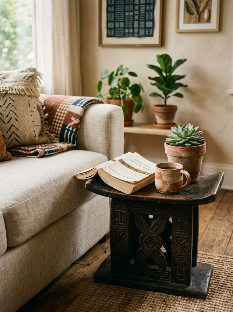 One of the most quietly brilliant afrohemian decor ideas is using authentic African furniture artifacts as functional decor. An Ashanti stool, hand-carved from a single piece of wood with its distinctive curved seat and waisted central column, carries centuries of Ghanaian cultural heritage while functioning perfectly as a side table. Placed beside a linen sofa with a ceramic mug and a small succulent on top, it bridges the gap between interior design and living history in a way no manufactured side table ever could.