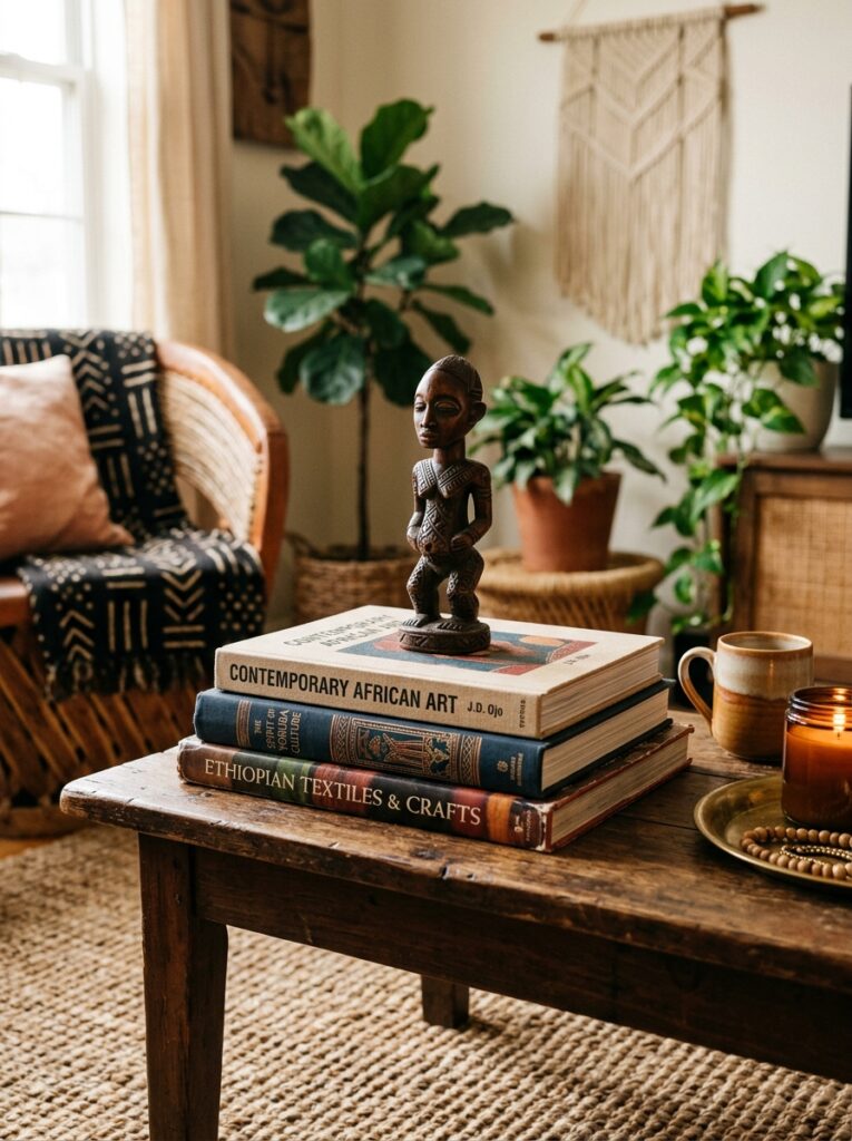 The coffee table book stack is a small but meaningful afrohemian decor ideas detail that communicates the values and curiosities of whoever lives in the space. A curated stack of large-format hardcover books on African art, architecture, textile traditions, and photography, topped with a small hand-carved wooden sculpture, tells a story about cultural pride, intellectual curiosity, and intentional living. Choose titles that genuinely reflect your interests: authenticity resonates far more powerfully than decorative props.
