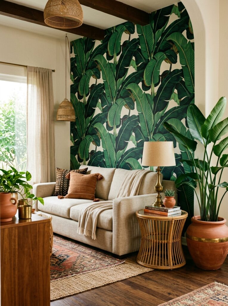 An oversized banana leaf tropical wallpaper in deep forest green and black creates one of the most dramatically beautiful accent walls in afro bohemian living room decor. The lush, organic scale of banana leaves connects the interior to the tropics of sub-Saharan Africa, while the deep forest green palette anchors the room with grounded sophistication. Against this bold backdrop, natural linen furniture and rattan side tables become crisper and more refined. The contrast does design work that neither element could achieve alone.