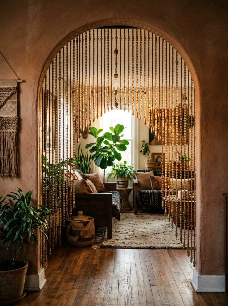 A cascading curtain of wooden and brass beads in a doorway arch is one of those deeply sensory afro bohemian living room decor details that transforms a transition space into an experience. The soft clatter of beads, the warm light catching brass as you walk through, the glimpse of green plants and warm interior beyond. These small, considered moments define the afrohemian aesthetic’s relationship with the senses. It is decoration that you feel, not merely see.