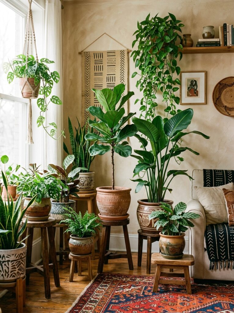 Plants are not accessories in afrohemian decor. They are structural elements. A well-curated plant corner in an earthy bohemian living room with African textiles brings the landscape indoors, connecting the space to the lush, verdant environments that inspire the style’s broader aesthetic. Fiddle leaf figs, birds of paradise, and trailing pothos at varying heights on wooden stands create a layered green wall effect. The key is the containers: handmade ceramic pots and terracotta planters, each slightly different in size and tone, that echo the room’s wider material palette. The Spruce notes that grouping plants in odd numbers at dramatically varying heights is one of the most reliable ways to achieve that lush, collected-over-time effect that is central to the afrohemian look.
