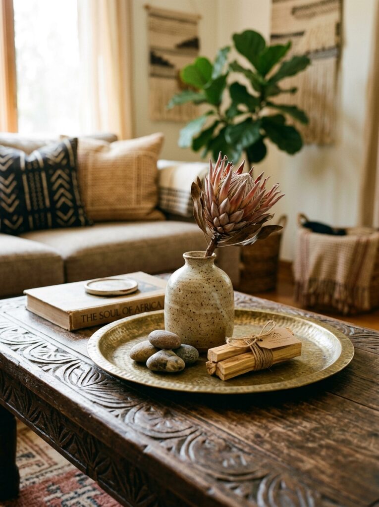 The coffee table vignette is one of interior design’s smallest canvases and one of its most revealing ones. In an afro bohemian living room, every object on the table should earn its place with either beauty, story, or function. A hand-carved dark African wood coffee table becomes the foundation; a hammered brass tray corrals smaller objects; a dried protea in a textured ceramic vase adds organic height. Even something as simple as a few smooth painted river stones in earthy tones can ground a vignette with low, organic detail that feels completely at home in an afrohemian space.