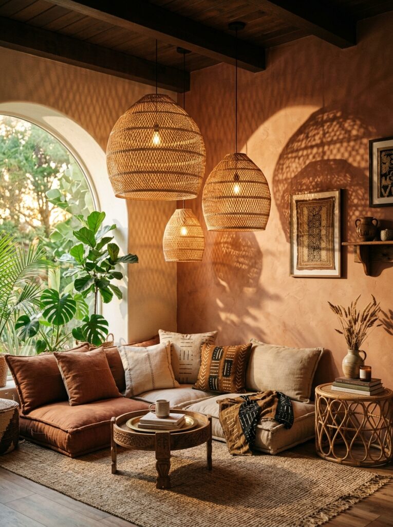Lighting is the single most underestimated element in afro boho home decor, and a cluster of oversized rattan pendant lights hung at varying heights may be its most transformative expression. The warm, dappled patterns that rattan casts across terracotta walls at golden hour are impossible to replicate with any other fixture. Three pendants hung at different heights create a sense of organic asymmetry that feels considered rather than random, and the pooling warmth below makes even a simple floor cushion setup feel like a retreat.