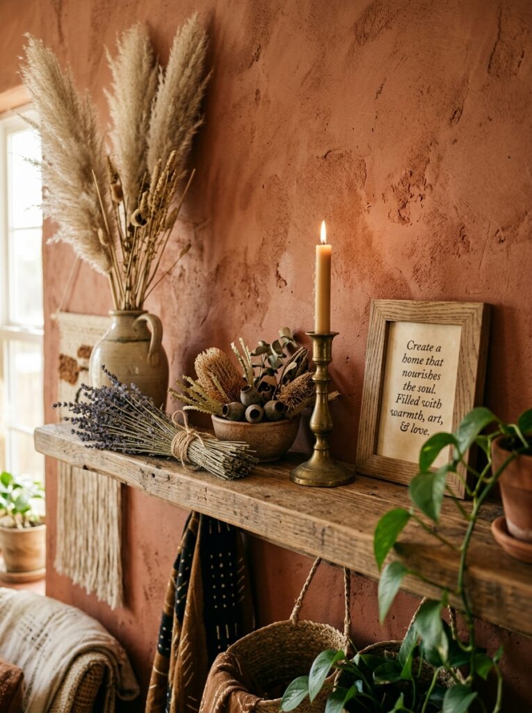 The floating shelf in an earthy bohemian living room with African textiles is a curated still life rather than a storage solution. Dried pampas grass for height and movement, dried lavender bundles for fragrance and color, natural seed pods for organic texture, a brass candleholder for warm light, and a small framed text print for personal meaning. Five elements that together create a shelf composition of genuine beauty. Against a terracotta wall, every earthy tone in the arrangement is amplified and warmed.