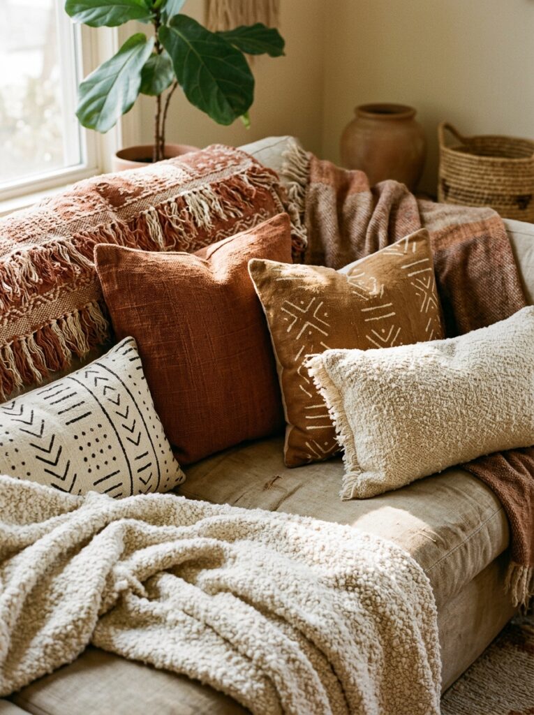 The mastery of textile layering is what separates a truly considered earthy bohemian living room with African textiles from one that merely has nice individual pieces. Rust, sienna, cream, and warm brown cushions and throws in boucle, mudcloth, and linen textures, layered together without a single jarring note, create a sofa composition of extraordinary warmth and depth. The afrohemian color palette ideas guiding principle applies perfectly here: stay within your earthy warm family, then vary only texture.