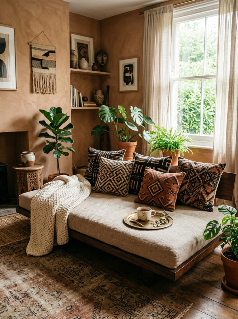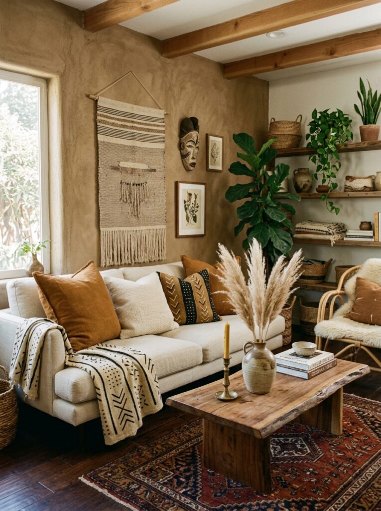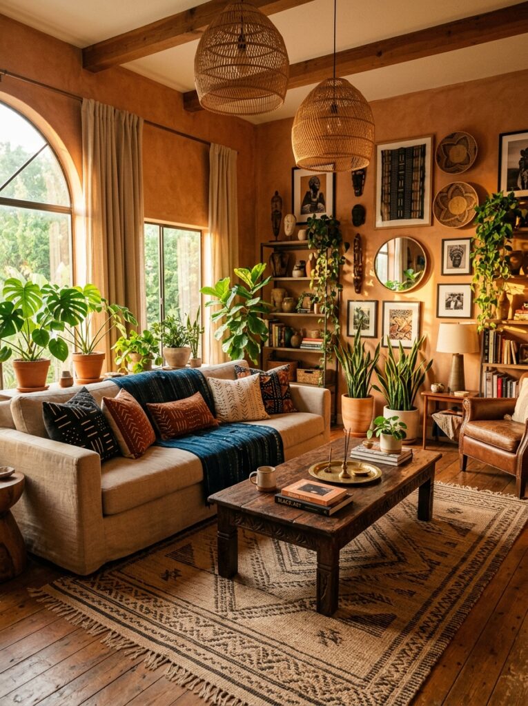 Walk into a well-realized afro bohemian living room and you feel it before you consciously process it: warmth from the terracotta walls, texture from the mudcloth throws, life from the lush indoor plants, history from the hand-carved wooden furniture. It is design that does not simply fill a space. It tells a story.