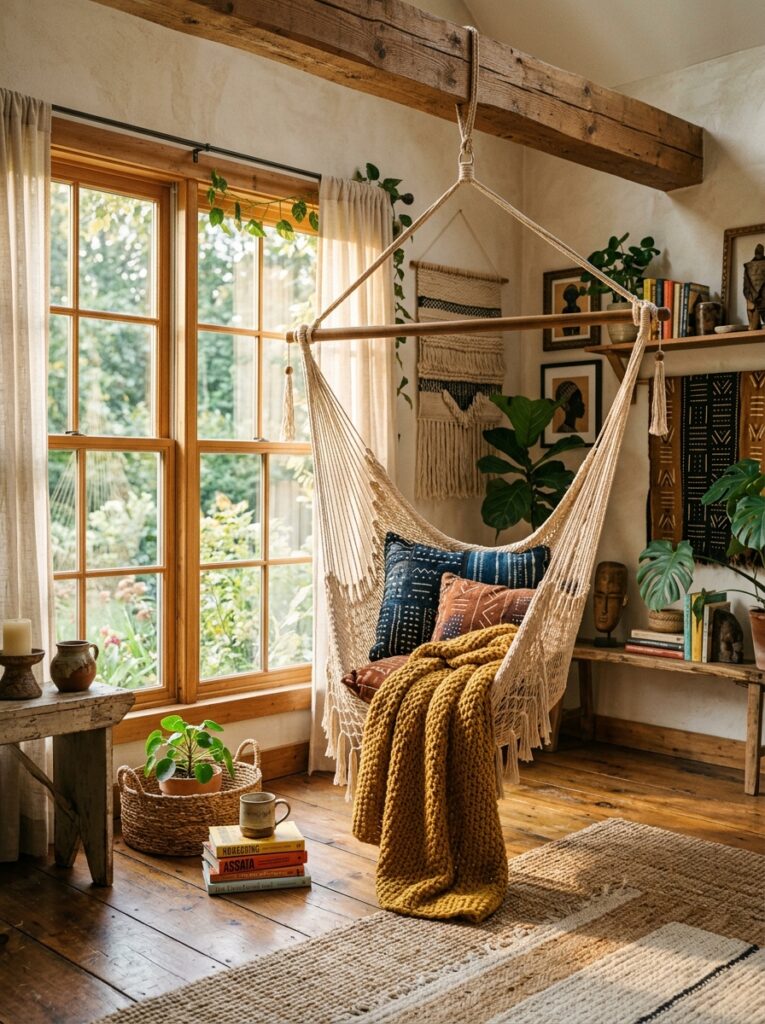 There are few more universally appealing seating moments than a woven cotton rope hammock chair hung from an exposed wooden ceiling beam beside a large sunlit window. In an African boho living room, it represents the style’s core value: comfort that is never separate from beauty. A casually draped knit throw, a small stack of books on the floor below, and golden afternoon light streaming in complete the picture. This is not staging. It is living.