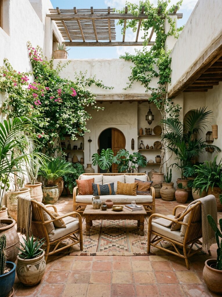 The indoor courtyard living space is afrohemian living at its most architectural. A rattan sofa and chairs on terracotta tile floor, whitewashed walls with climbing green vines, dappled sunlight filtering from above through an open ceiling, potted palms and ceramic pots completing the picture. This space draws from the riads of Morocco, the courtyard homes of West Africa, and the Mediterranean climate vernacular, synthesizing them into something entirely new and deeply inspiring for afro bohemian living room decor ideas.