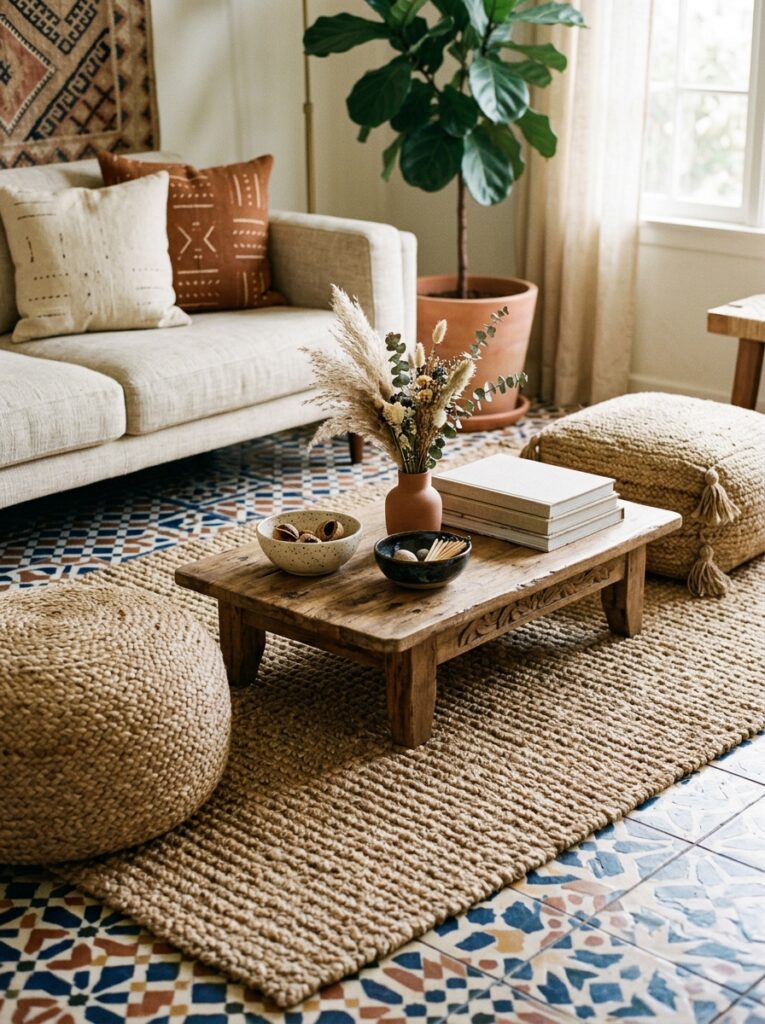 Layering a chunky natural jute rug over geometric Moroccan tile flooring is a master class in the afro boho home decor approach to texture. The rough organic weave of jute against the cool precision of tile creates a tactile conversation that anchors the whole room. This is the earthy bohemian living room with African textiles philosophy expressed at floor level, where every material chosen tells a story about nature, craft, and cultural exchange across the African continent and the Maghreb.