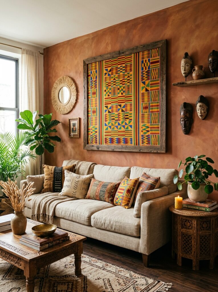 Kente cloth, originating from the Ashanti and Ewe peoples of Ghana, is among the most visually spectacular textiles on earth. Framing an authentic Kente cloth panel and hanging it above the sofa as statement art transforms any African boho living room wall from decorative background into cultural conversation piece. The interweaving of vibrant color strips, each carrying specific symbolic meaning, sits in magnificent contrast against terracotta and sienna walls, making it one of the most impactful of all afrohemian decor ideas.