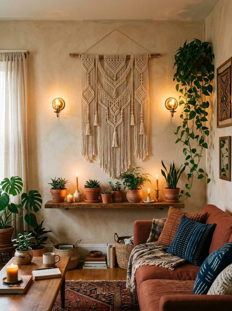Floor-to-ceiling macrame has made a well-deserved return to interiors, and it finds its most beautiful home in afro bohemian living room decor. Natural cotton rope, hand-knotted into intricate patterns, brings organic texture to walls that paint simply cannot replicate. The addition of brass wall sconces on either side introduces the warm metallic quality central to the afro bohemian color palette ideas. That interplay between natural fiber and warm metal gives the style its luxurious, grounded feeling.