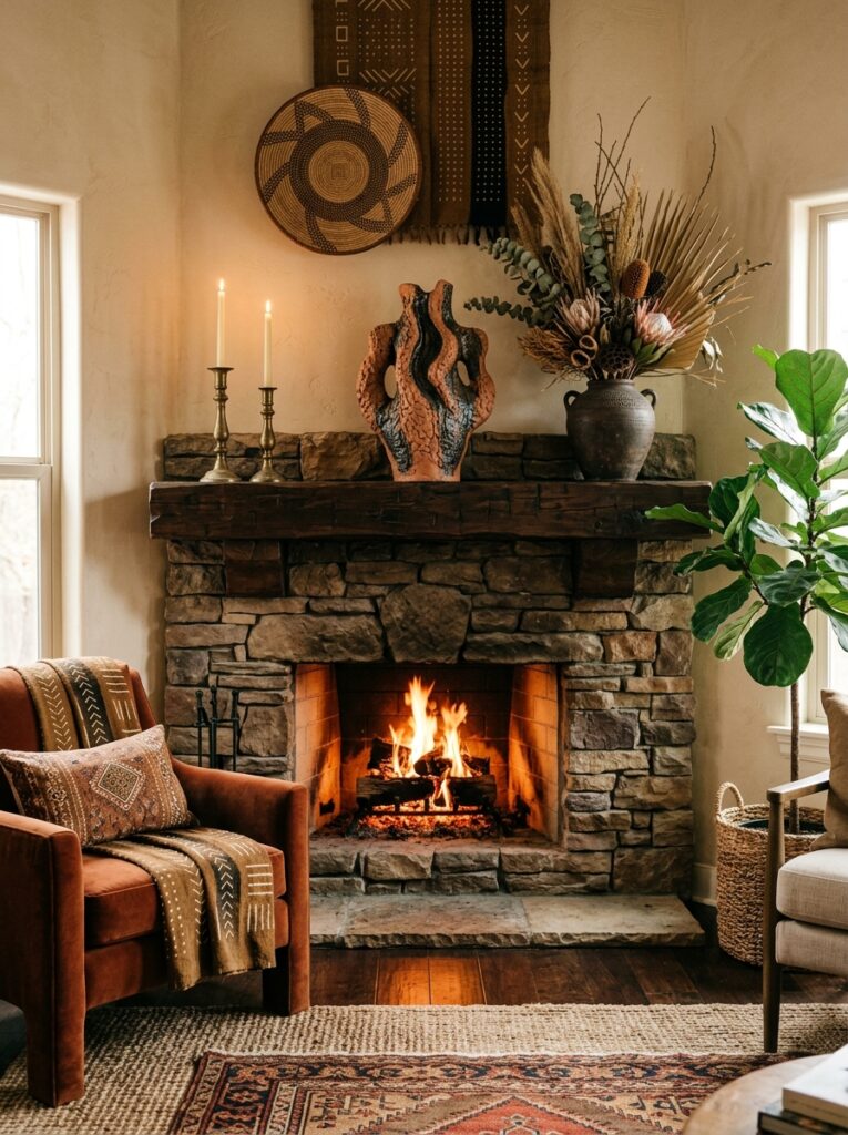 Where architecture and afro boho home decor meet, the result is a fireplace that commands the room. Stacked natural stone surround, carved dark wood mantle, brass candlesticks, a sculptural dried botanical arrangement, and a large textured ceramic sculpture as the central mantle object. This is fireplace styling that understands the afrohemian color palette ideas principle completely: layer warm natural materials in varying textures and let the firelight do the rest. The result is a hearth that feels both ancestral and entirely contemporary.