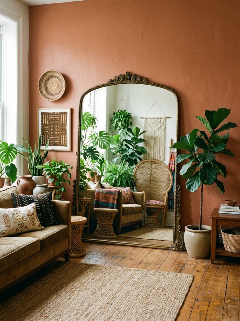A large arched vintage floor mirror leaning against a terracotta wall is one of the most effective afrohemian decor ideas for adding depth and light to a living room without structural changes. As it reflects the room’s lush indoor plants and rattan furniture back into the space, it creates a layered, almost jungle-like impression that amplifies the organic, green energy of the afrohemian style. The arch shape echoes the rounded, organic forms found throughout African architectural traditions.
