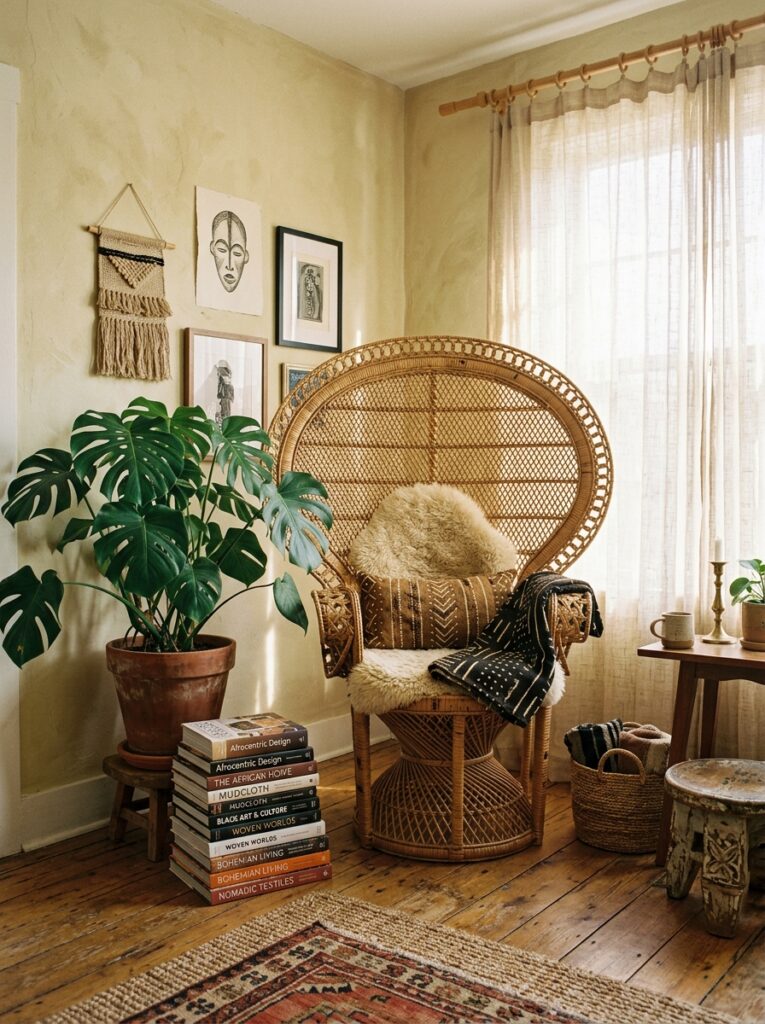 A large rattan peacock chair is perhaps the single most recognizable piece of afro boho home decor furniture, and for good reason. Its dramatic arching form creates an instant focal point in any corner while remaining completely in harmony with the natural, organic materials that define the afrohemian aesthetic. Soften it with a sheepskin cushion, stack some art and culture books beside it, and let a monstera plant lean in naturally. You will have a corner that people want to photograph every time they visit.