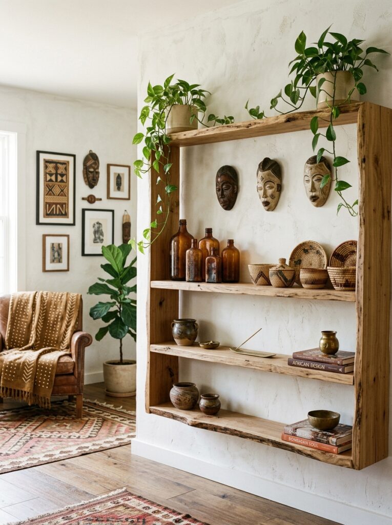 Open raw-edge wooden shelving on a limewash white wall is one of the most versatile canvases in an African boho living room. The natural wood grain, preserved at the slab’s organic edges, is itself a decorative statement. A celebration of material honesty that runs through afrohemian design philosophy. Styled with African ceramic masks, trailing pothos plants, hand-woven small baskets, and vintage amber glass bottles, each shelf becomes a chapter in the room’s ongoing cultural narrative.