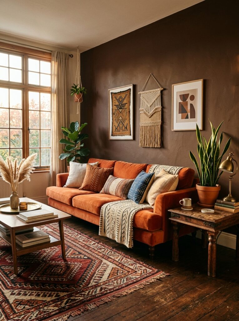 Not every afro bohemian living room has to default to linen neutrals. The afrohemian color palette ideas tradition includes bold, saturated moments, and a deep sunset orange velvet sofa against a chocolate brown wall is one of the most confident expressions of this. It is warm, it is dramatic, and it is completely in harmony with the color language of the style: the oranges of Malian clay, the browns of Ghanaian carved wood, the reds of Moroccan leather. Layered with cream and rust cushions, this sofa becomes the entire room’s personality.