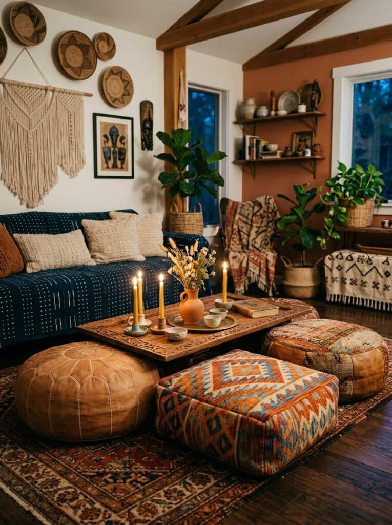 Pouf seating is one of afro boho home decor’s most functional and culturally resonant contributions to modern interiors. Low floor-level living, gathered around a central tray table, seated on leather and kilim woven poufs, speaks to communal gathering traditions across North and West Africa. Three poufs arranged around a low carved wooden tray table with candles and small ceramics creates a seating vignette that encourages the kind of close, relaxed conversation that the afrohemian living style is built around.