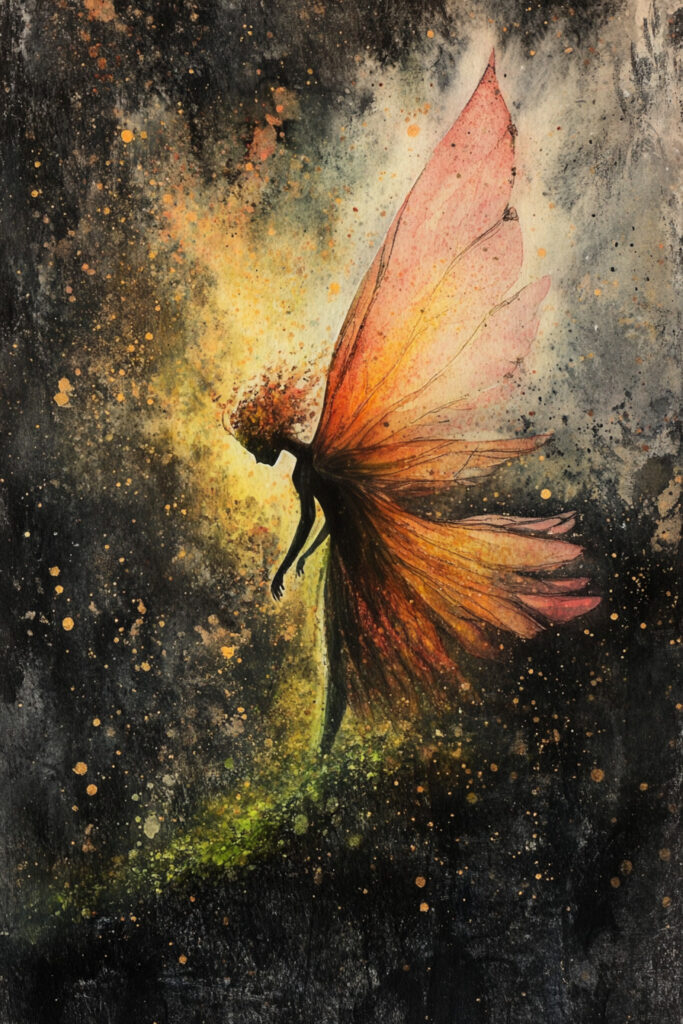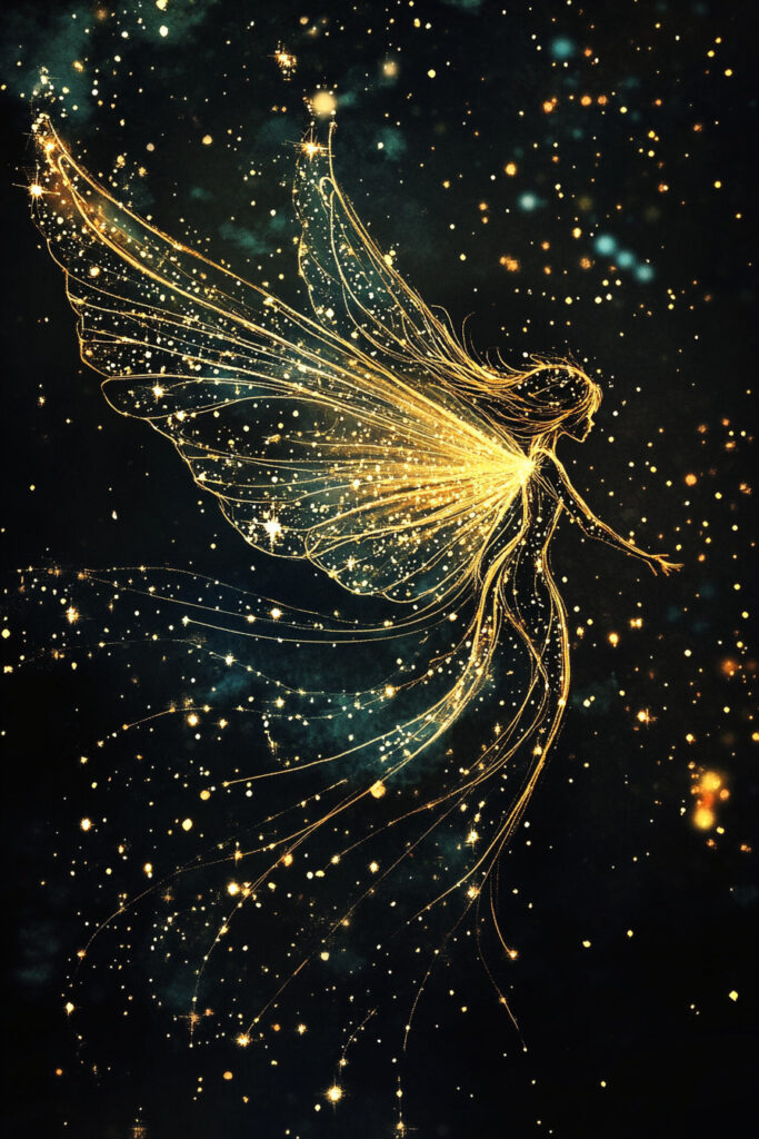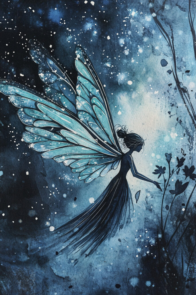 This is what enchanted forest fairy watercolor art looks like when it reaches into deep space. The wing veins glow like mapped constellations, and shooting stars stream from the membrane surfaces outward into the darkness. Warm gold and white against midnight indigo and black create one of the most dramatic palettes in the entire collection.