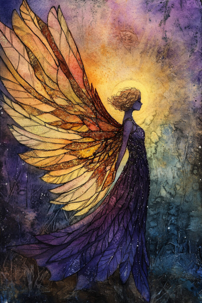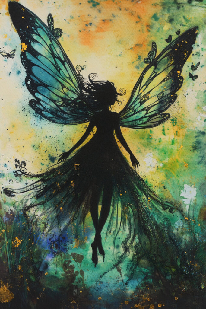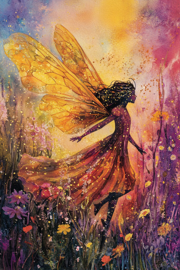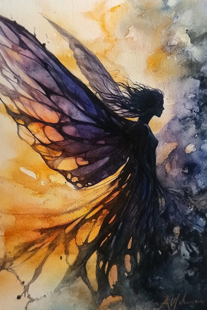This is one of the most striking watercolor fairy painting ideas in this collection. The trick is to let the warm pigment bloom freely at the wing edges. Do not fight the bleed. Let it go where it wants to go.