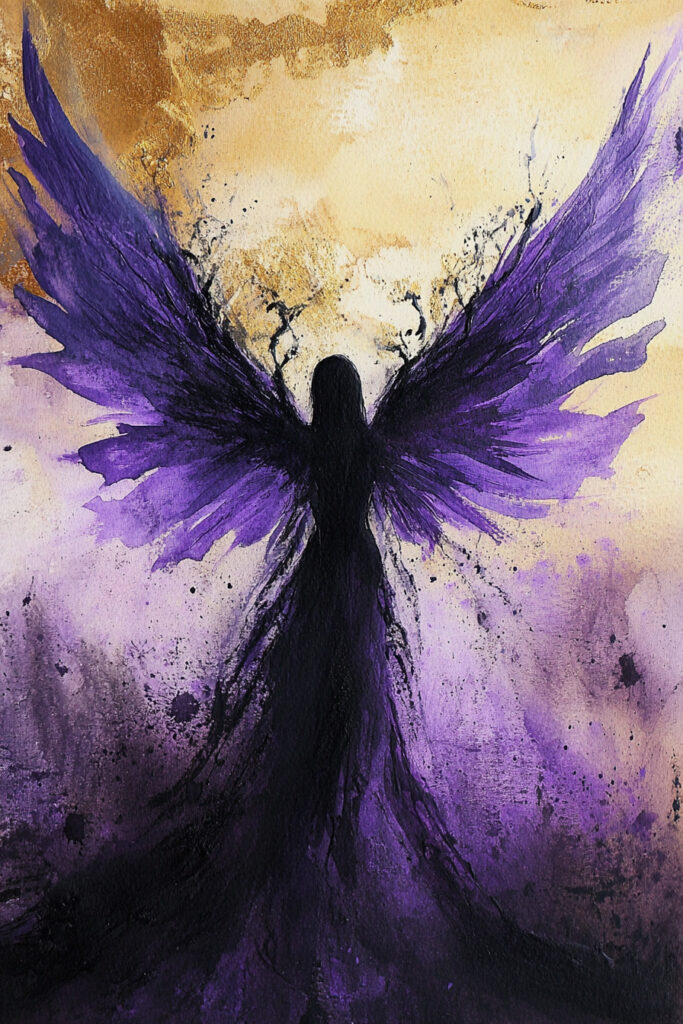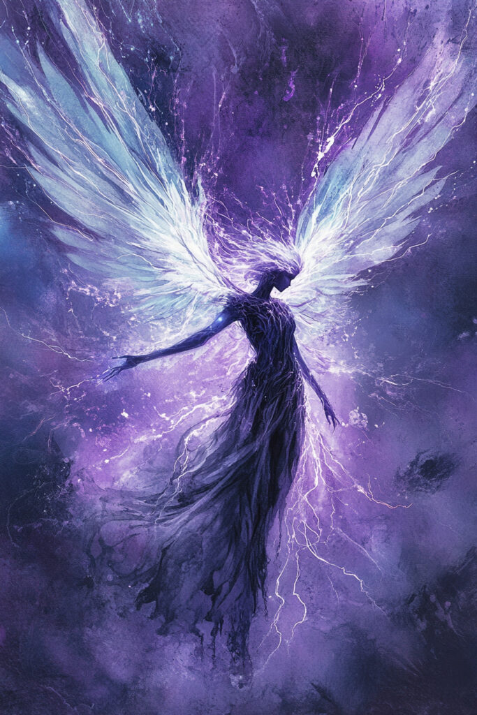 The wing surface here does not just look stormy. It churns. Charcoal and electric violet pigments move across the membranes like an actual storm system, and lightning cracks outward from both wings. The warm gold and ochre horizon below adds the classic contrast that makes every dark watercolor scene pop.