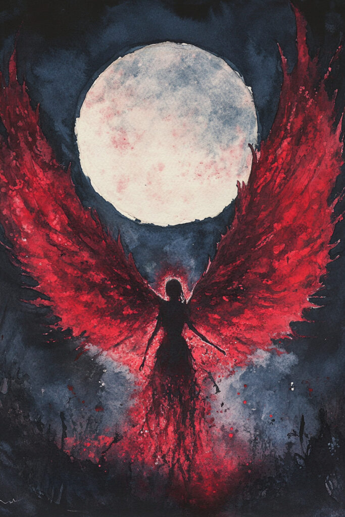 The full moon sits perfectly framed between both wings, bathed in the deep crimson glow radiating from the wing membranes. Dark burgundy and midnight blue-black make this one of the most dramatic fairy watercolor art ideas in the entire collection.