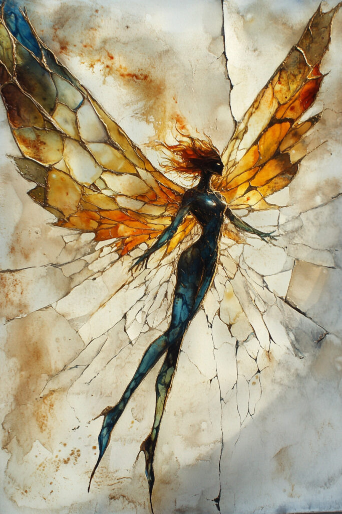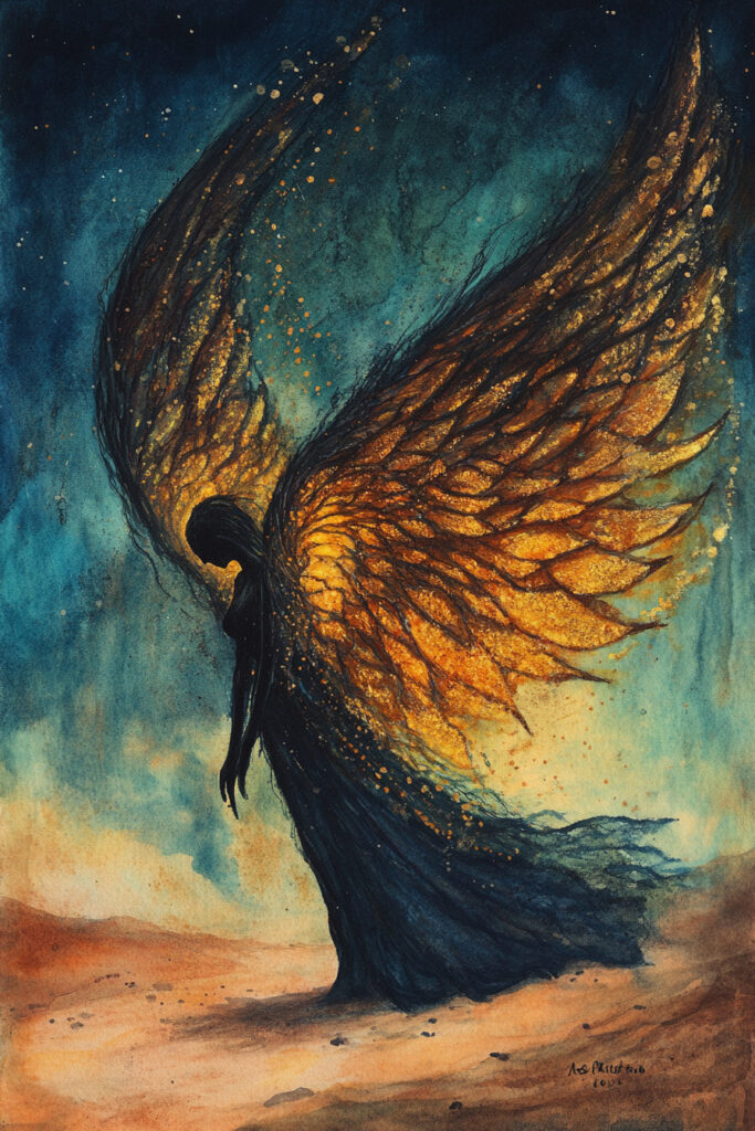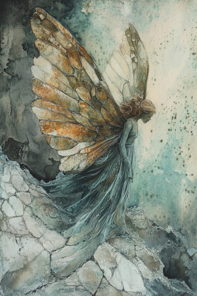 The contrast between the cool, saturated wing tones and the warm, parched ground is everything in this composition. One of the most emotionally satisfying fantasy fairy watercolor scenes in the collection.
