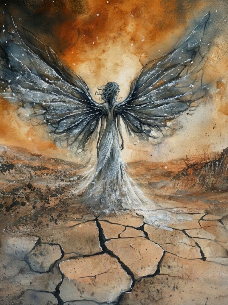 Cool silver and deep slate blue wings hang heavy with gathered moisture, and the first rain pours from them onto cracked terracotta and burnt sienna earth.