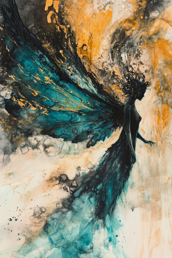 The only exceptions are the vivid warm gold and electric teal energy crackling at the very edges. This is a masterclass in using restraint to create drama in your fairy watercolor art.