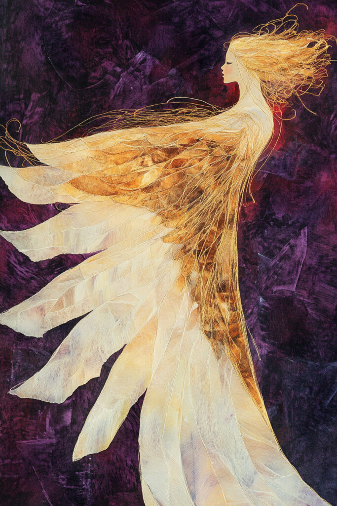 Warm pearl, ivory, and gold threads unravel from the wing membranes in mid-spin, wrapping the surrounding air in a luminous silk cocoon. Each wing vein is a separate glowing thread.