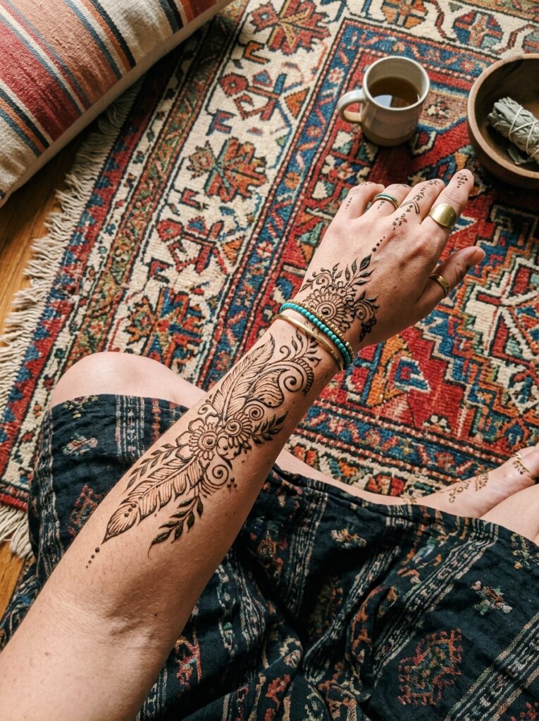 Free-spirited, textured, and full of personality — this boho forearm wrap mixes detailed feathers with loose wildflowers in a composition that feels organic and unscripted. Fine-line feather detail sits alongside relaxed floral motifs in a design that is both technically impressive and refreshingly casual. Perfect for those who want their henna to feel like an expression of self rather than a formal design.