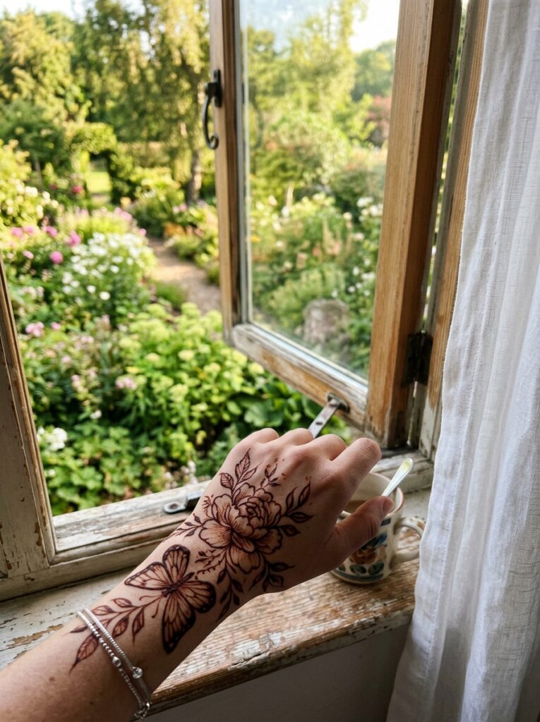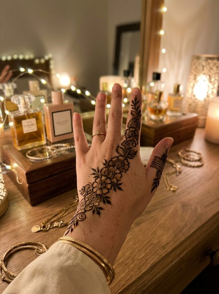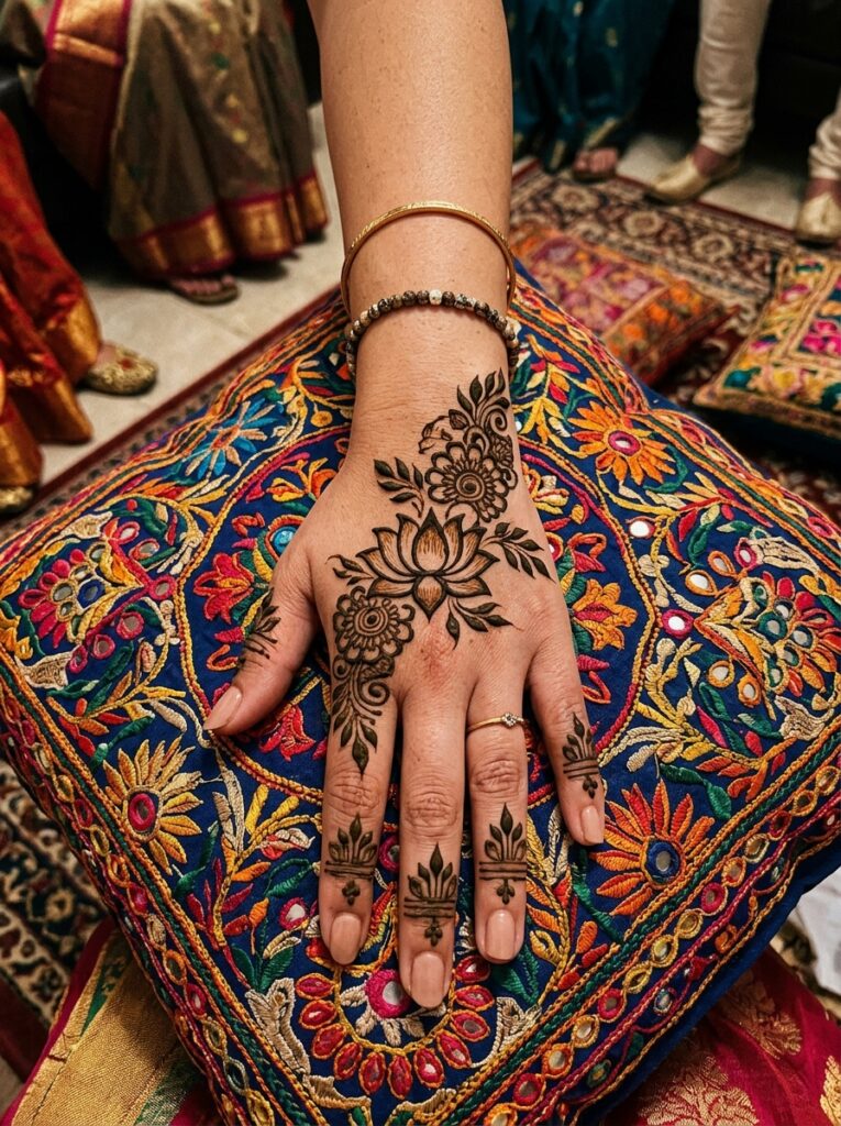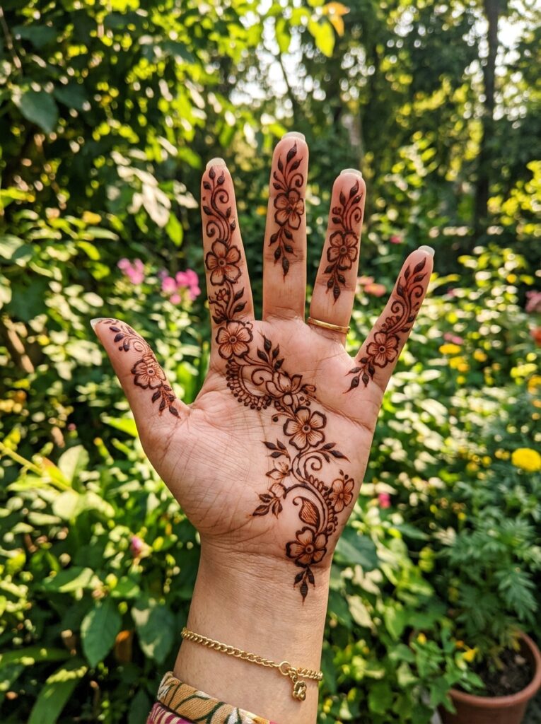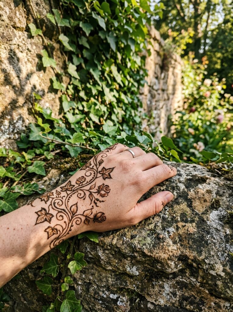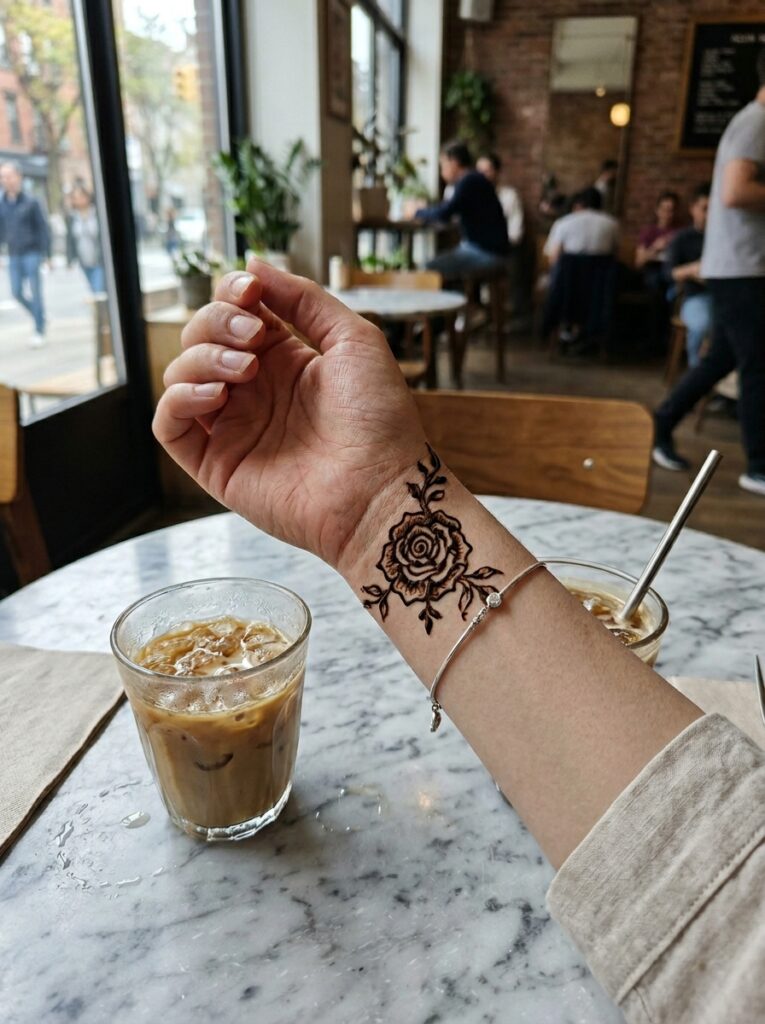 - Single-placement designs — one flower on one finger, or one motif on one wrist, is infinitely more manageable than a full-hand composition