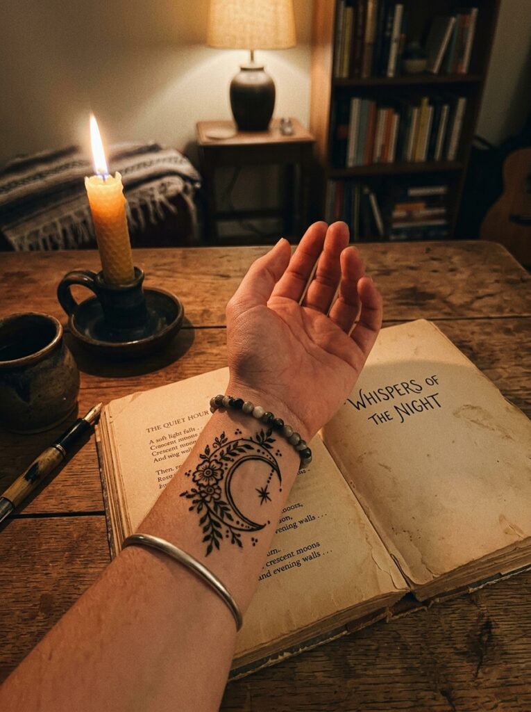 A crescent moon formed entirely from clustered small flowers and leaves — this design is both mystical and deeply botanical, combining the romance of celestial symbolism with the detail of traditional mehndi florals. The floral half moon sits beautifully on the inner wrist as a piece that feels personal, intentional, and quietly magical. A truly original design within the world of henna flower designs for wrists.