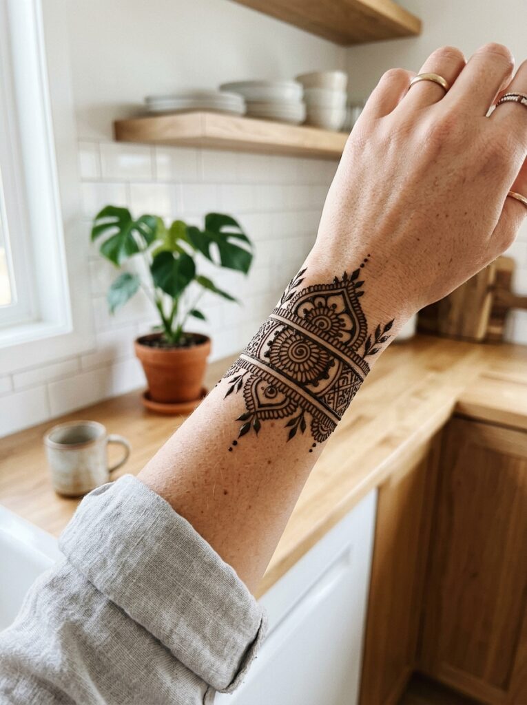 ✦ Artist Tip: Inner wrist skin is sensitive; apply henna gently and encourage the wearer to keep the area warm during the drying process for a deeper stain.
