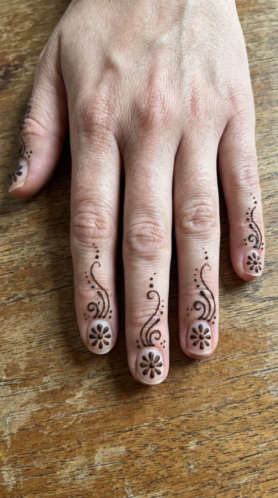 Not every beautiful henna design needs to cover the entire hand. These wild daisy fingertips prove that restraint can be just as striking — tiny daisies bloom at the top of each finger with small dots and curved lines trailing gently downward. It is a thoroughly modern take on henna designs for beginners flowers: minimal effort, maximum charm.