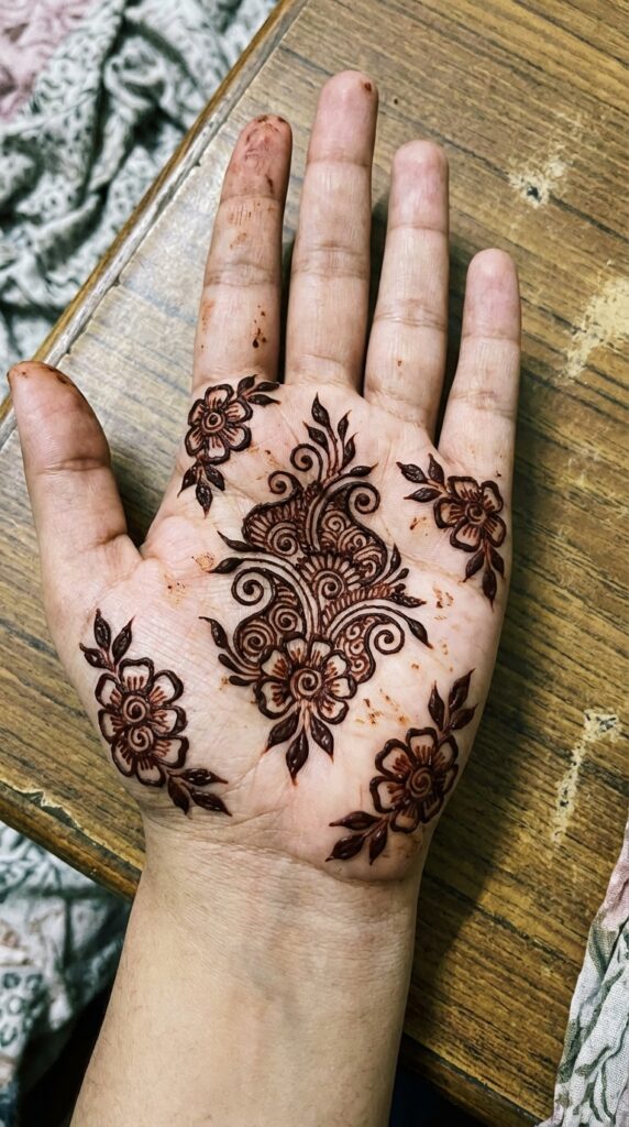 Open your palm to reveal a garden in full bloom: a large central rose surrounded by smaller flowers in each corner, vines and leaves weaving between them across the entire palm. This classic garden party palm design is generous, abundant, and deeply satisfying — everything traditional mehndi was designed to celebrate. A timeless choice among floral henna designs for hands with real staying power.