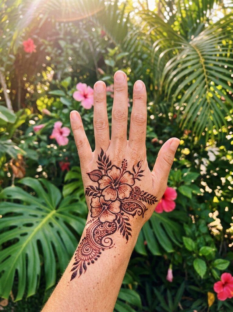 Tropical, vibrant, and full of personality — the hibiscus half-hand design brings a lush island energy to traditional mehndi. The bold layered petals of a large hibiscus anchor the thumb side of the hand, with sweeping leaves and small buds filling the surrounding space in a composition that feels both abundant and organized. A beautiful choice for those who love floral henna designs for hands with a tropical twist.