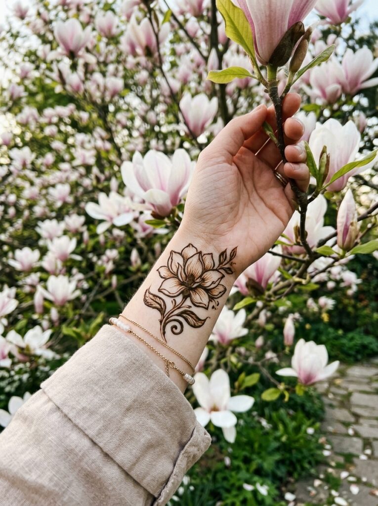 Magnolias are among the most architecturally beautiful flowers in nature, and this wrist wrap design honors every cupped petal, broad leaf, and fine dot accent with stunning accuracy. The bold composition wraps around the wrist with confidence, making it one of the most dramatically beautiful henna flower designs for wrists in this entire collection. Botanical mehndi at its very best.