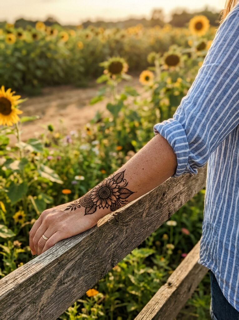 Bold, sunny, and impossible to ignore — the sunflower wrist design commands attention in the best way. A large detailed sunflower anchors the wrist while botanical stems and leaves extend up the forearm, with crosshatch shading inside each petal adding gorgeous dimension. This is one of the most striking henna flower designs for wrists for those who love a statement piece that feels fresh and modern.