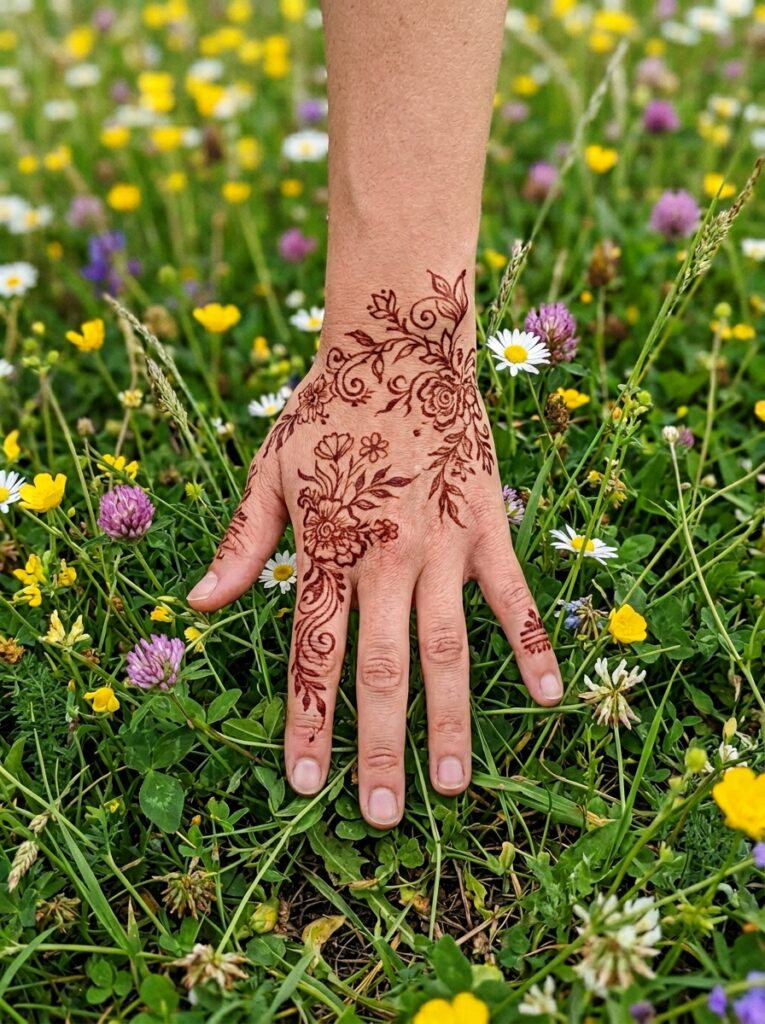 Scattered dandelions, daisies, small buds, and flowing grass stems arrange themselves across the back of the hand in a free-form organic composition that looks like a garden pressed onto skin. This wildflower meadow design sits at the intersection of botanical art and modern mehndi, with a relaxed, organic energy that feels refreshingly different from symmetrical traditional styles.