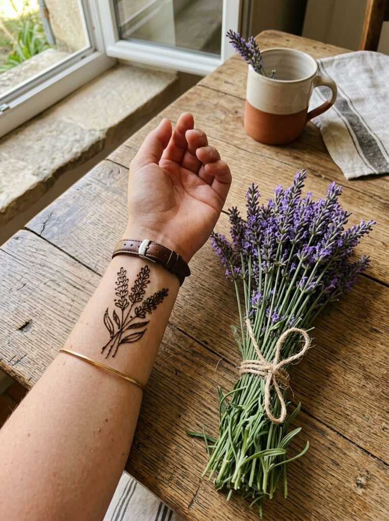 Delicate lavender sprigs circle the full wrist in a design so refined it could pass for a fine botanical illustration. Tiny detailed flower clusters on slender stems create a bracelet of extraordinary elegance from very simple elements — proof that henna designs for beginners flowers can be both achievable and genuinely beautiful. A perfect first wrist design for anyone just starting their henna journey.